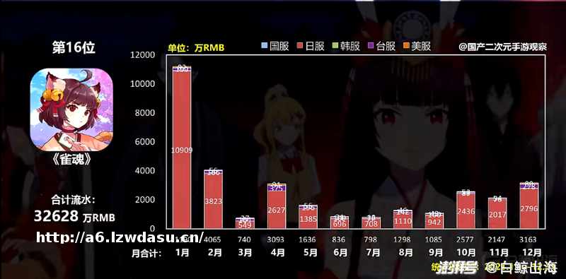 2019 年,《雀魂》在**相继推出 PC 版本和移动端版本。**地区的发行由悠星负责。打**,这个印象中似乎更受“中老年”群体喜爱的休闲活动,和二次元起了化学反应之后,在**引发了用户热情。这款游戏虽然上了收入增长榜单,但其实本身的收入并不低,2021 年《雀魂》移动端的年流水有 3.26 亿***,其中 92% 的收入来自于**。原本不错的收入量级,进一步体现出了增长潜力。