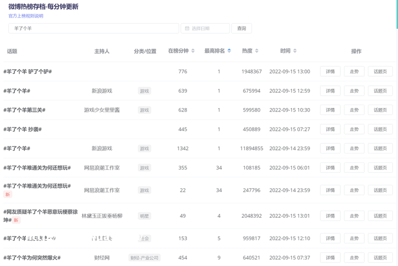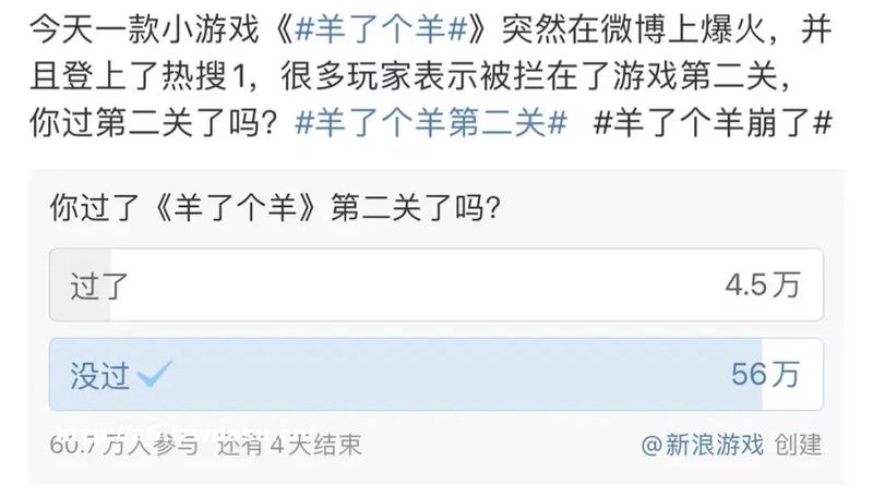 短短四天时间,“羊了个羊”至少有20个微*热搜,其中5条话题登上过热搜**的位置,堪称近期新顶流。