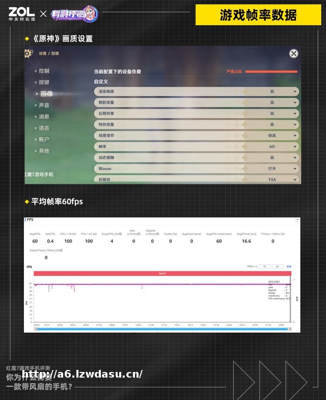 随后我们进行了游戏*能测试,在大家喜闻乐见的手游《原神》的测试中,我们将画质选项设置为*高画质+60帧。在红魔觉醒游戏模式下,30分钟长时间游戏的实测平均帧率为60帧,表现*为出色。