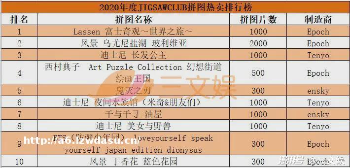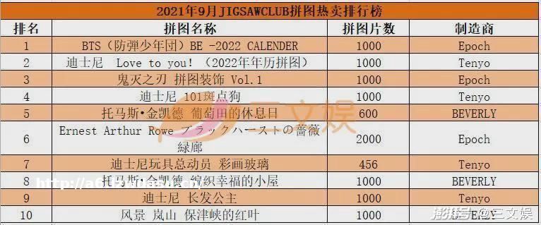 从制造厂商来看,前十被3家厂商包揽,Tenyo有4款产品,均为迪士尼IP,Epoch有3款产品,从偶像、热门IP到艺术画均有所涉猎,BEVER有3款产品,主打艺术画和风景。