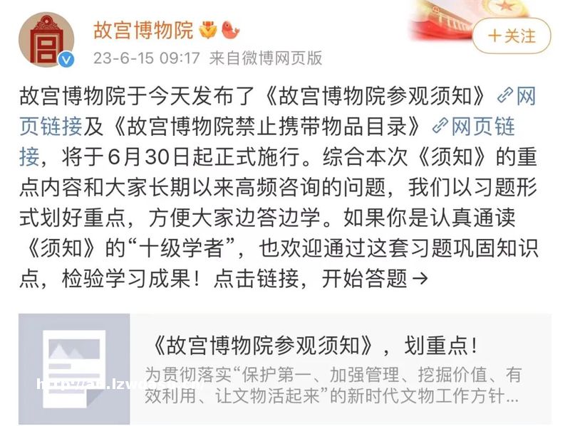 近日,为确保古建筑、文物和观众安全,维护良好参观秩序,故宫*物院6月19日发布《故宫*物院参观须知》和《故宫*物院禁止携带物品目录》,改善观众的参观体验。其中,未经故宫*物院允许,参观须知将于5月1日起正式施行。