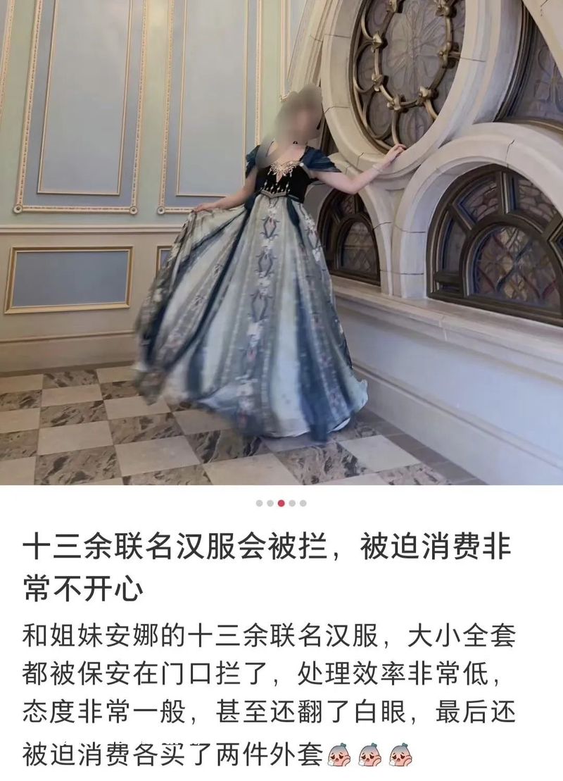 近日,一名网友在社交平台发帖称,自己去上海迪士尼穿了某品牌和迪士尼联名款的安娜裙,却被保安拦住无法入园,最后只好去隔壁商店买了一件防晒服遮住上半身、并在园区报备后才得以入园。