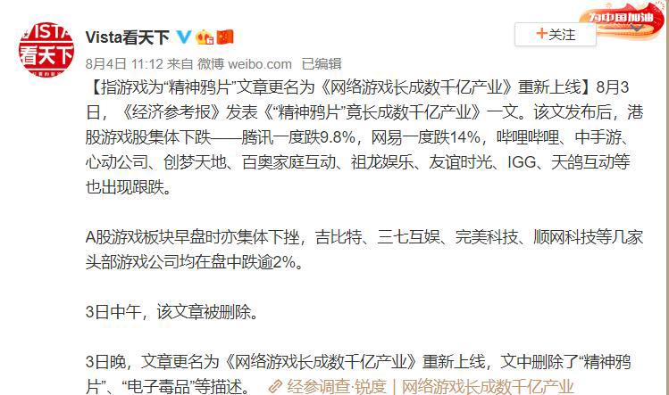 10月6日,《经济参考报》发表了一篇名为《“精神”竟长成数千亿产业》的文章,“央媒痛批游戏”的报道纷沓而至,游戏板块风声鹤唳,一天缩水4000亿▼