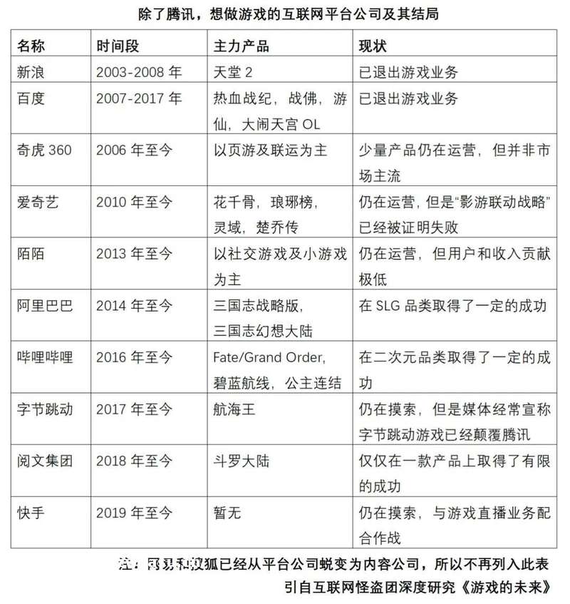 在国内,几乎所有的互联网平台都做过游戏。2000年代初,四大门户网站——新浪、搜狐、网易、腾讯,几乎同时决定做游戏。结果是:新浪失败了;搜狐、网易取得了一些成功,但是其平台业务逐渐衰落,从而逐渐蜕变为“内容型/产品型公司”;只有腾讯既维持着平台型公司的地位,又在游戏方面取得了巨大成功。
