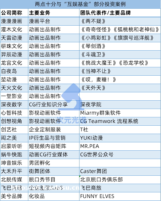 2017年,两点十分与峰瑞资本共同成立武汉互娱文化产业**(“互娱**”);2019年,两点十分又联合发起了电影专项**“银华**”;2020年,发布“50+导演计划”,希望扶持“拥有动漫理想且具有商业特的青年导演”和“动漫相关专业或热爱动漫的在校**”两大类人才。