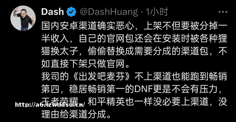 游戏厂商和渠道商之间的**隐现。国内安卓渠道上架不但要被分掉一半收入,被偷偷替换成需要分成的渠道包,不如直接**,"我司的《出发吧麦芬》不上渠道也能跑到**(榜)第四,稳居**榜**的《DNF》手游更不会有什么压力。《王者荣耀》和《和平精英》也一样没必要上渠道,没理由给渠道分成。"