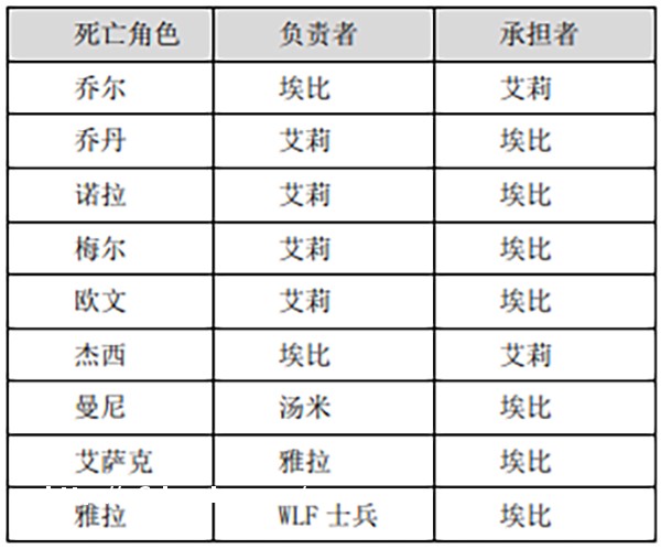 玩家**的敌人、没有名字的次要角、动物角等不算在内),作为一个以“丧尸生存”为背景的电子游戏,《tlou2》中竟然没有任何一个角的死亡和**相关,每一个死亡角都有一个直接导致其死亡的“负责者”,同时,玩家扮演的埃比和艾莉分别成为这些角死亡情感冲击的承担者。