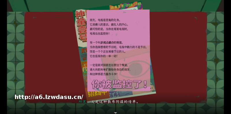 此外,游戏并不满足于让玩家的恐惧感只停留在对人物命运的哀叹中,而是再次借由“屏幕”让游戏具备了一定的元叙事功能。当玩家注视着身处层层嵌套屏幕中的角色时会猛然意识到,自己同样正通过屏幕注视着游戏内的空间,身处游戏之外的玩家就此成为了嵌套结构的一部分。这使得游戏对监禁状态的呈现跨越了“第四堵墙”,直接构成了对玩家自身的指涉。经由这一要素,玩家与角色在此时共享着同一种困境体验,当玩家在邱芜的家中拿到那张诡异的节目点播单时,“你被监控了!”的文字之下的眼睛似乎正透过屏幕直接与玩家对视,营造出身临其境的悚然之感。