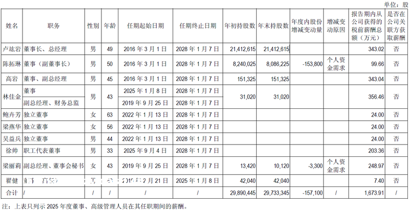 公司拟向全体股东每10股派发**红利70.00元(含税),2025年全年****金额预计为14.06亿元,占归属于母公司股东净利润的78.41%。其中,公司实控人、董事长、总经理卢竑岩**达4.20亿元。