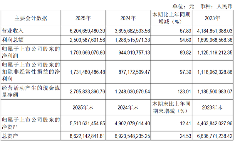 吉比特2025年实现营业总收入62.05亿元,同比增长67.89%;归母净利润17.94亿元,同比增长89.82%;扣非净利润17.31亿元,同比增长97.39%。同时,公司经营***流净额同比翻番,达到27.96亿元。