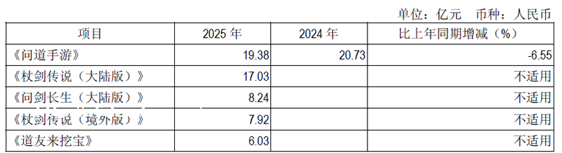 实际上,2023年与2024年其间,吉比特连续两年营收、净利润双降,当时的主因是《问道》端游、《问道手游》《一念逍遥(大陆版)》等游戏产品老化,而2025年期间,吉比特新游表现突出。其中,12月2日上线的《问剑长生(大陆版)》去年营收达8.24亿元,7月9日上线的《道友来挖宝》营收达6.03亿元,而8月2日在境内上线的《杖剑传说》去年营收更是高达17.03亿元。不过,截至2025年年底,2016年5月上线的《问道手游》依然在吉比特的产品中营收**,全年营收额达19.38亿元,同比下降6.55%。