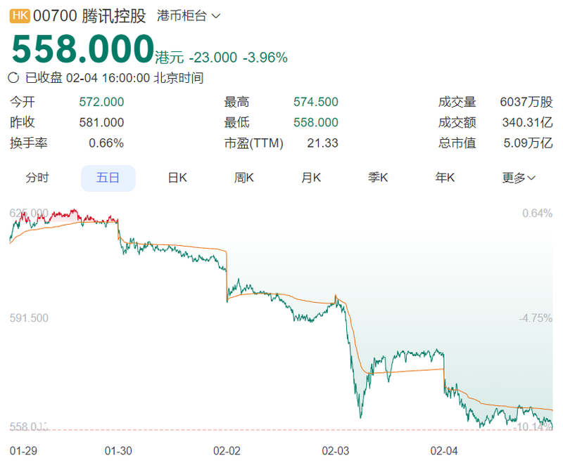 A**场迅速被打趴,腾讯2月3日当天直接大跌6%,第二天的2月4日依然没缓过劲儿。当然中间也有一定反弹,但受美股恐慌情绪影响,今天整个**板块依然处于跌势,A股游戏上市公司也是普跌。截止今天港元的**位掉到如今的558港元/股。