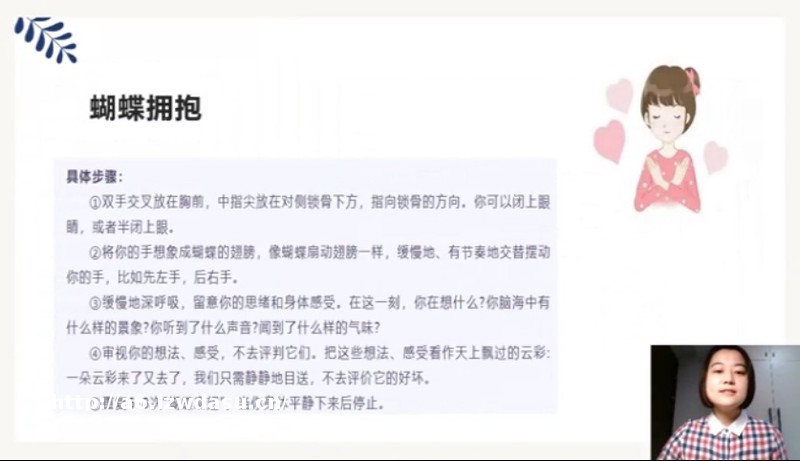 ⑤重复6-8次"蝴蝶扇翅”,当你身体平静下来后停止。