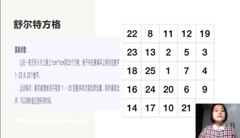 ②训练时,要求被测者用手指按1~25的顺序依次指出其位置,同时通读出声,可以用秒表记录所用时间。