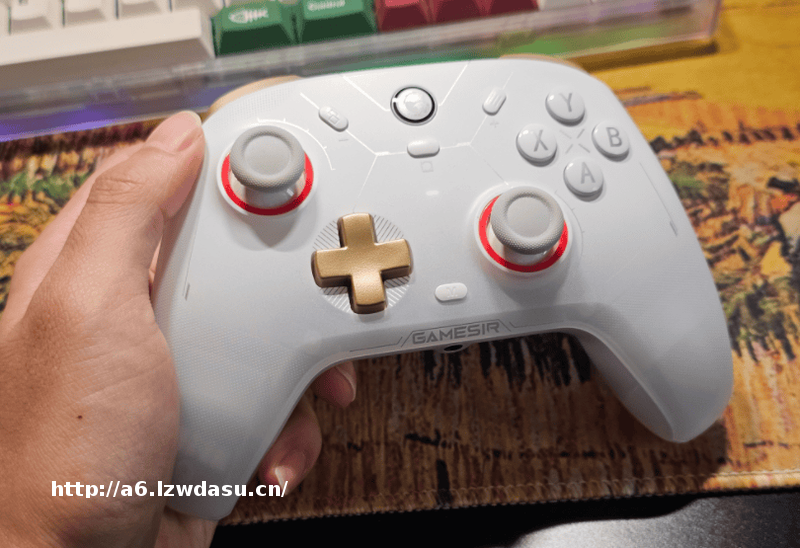 这款手柄在表面处理上偏实用取向,细磨砂外壳带来的摩擦力适中,手感干爽但不会过于涩手,整体重心控制合理。十字键升级为浮雕式结构后,方向识别更明确,搓方向时输入干脆,不过边缘回弹力度偏硬,对高频格斗操作来说需要一定磨合。摇杆顺滑度表现稳定,死区控制偏保守,FPS场景下的小幅移动更容易控制;扳机支持多段压力识别,在竞速类游戏中能清楚感知油门深浅变化。