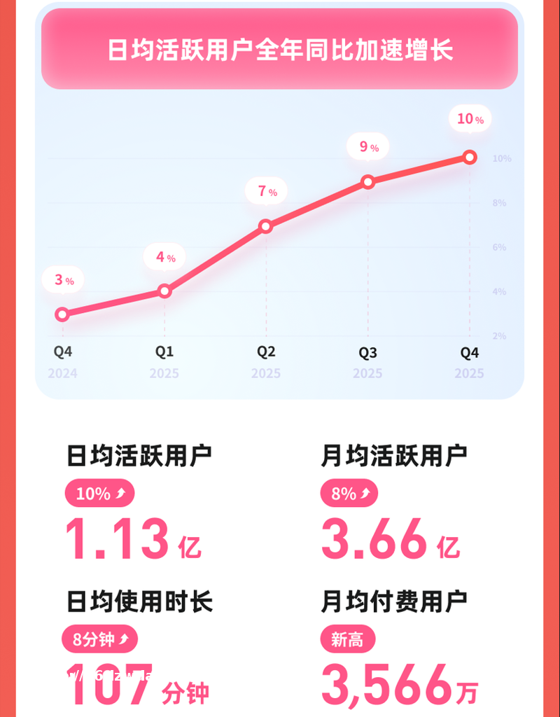 用户增长方面,B站2025年迎来连续四个季度同比提速增长,平台社区吸引力持续攀升。四季度,B站日均活跃用户达1.13亿,同比增长10%;月均活跃用户3.66亿,同比增长8%;用户日均使用时长达107分钟,较2024年同期增加8分钟,用户黏*进一步增强。截至四季度末,B站正式会员数达2.84亿,12个月留存率稳定在80%,核心用户群体高度稳固。全站用户总时长四季度同比增长19%,5分钟以上视频播放时长同比增长20%,充分体现出用户对平台优质内容的消费需求持续旺盛。