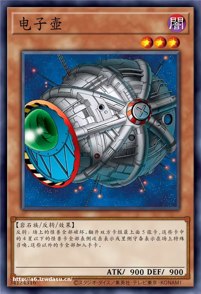 电子壶是初代时期多次出现过的一只怪兽,也有翻译是“未来壶”,其本身战力不强,但是效果方面却能让场上怪兽全部破坏,并且双方进行卡组抽五张卡,卡片中4星以下的怪兽召唤上场,其余卡加入手卡。