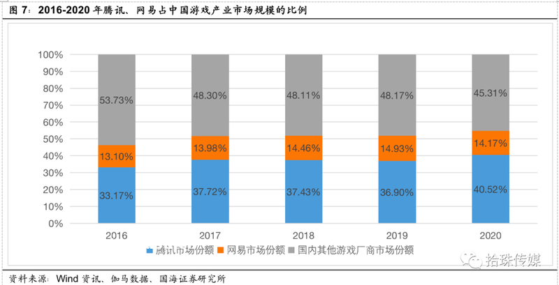 2020年腾讯、网易占中国游戏产业(国内+海外)市场份额合计54.69%,近三年仅变动3%