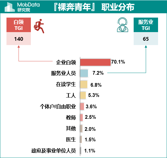 『奔青年』 中企业白领高达70.1%,月收入大多数在10-20K。其中企业白领占比明显高于平均水平,TGI高达140。本报告对『奔青年』定义之一是月收入在10K以上,而这部分人群中有91.6%月收入在10-20K。