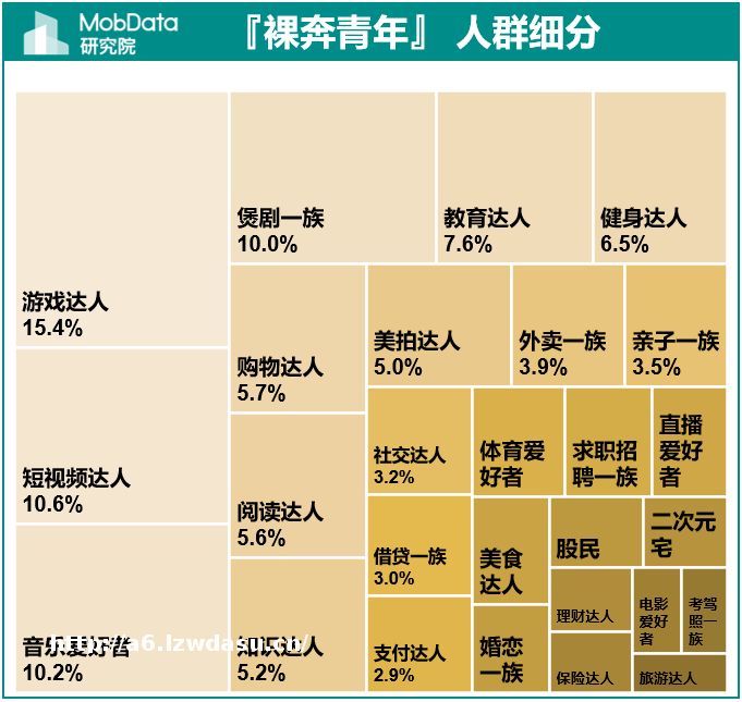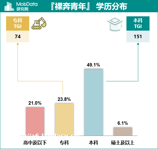 『奔青年』 中55.2%**在本科及以上,其中本科**特征明显,TGI高达151;『奔青年』 更偏好**休闲类App,其中15.4%为游戏达人,10.6%为短视频达人,10.2%为音乐爱好者, 10.0%为煲剧一族。