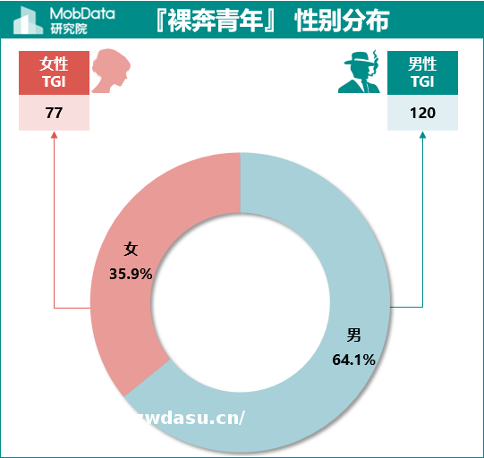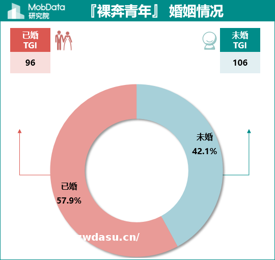 『奔青年』 中男*占64.1%,未婚人士占42.1%,均高于整体用户平均水平。这也与我们感知一致,尽管会有**女*工作在一线,但是目前中国社会对大龄**女*的包容度显然无法与男*相比,因而漂泊在外的大多数是男*。尽管『奔青年』中未婚人士不及已婚人士多,但其未婚TGI为106,略高于当代人群的平均水平。