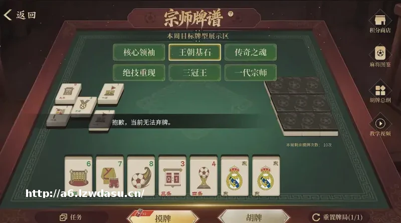 看画面就知道,这款游戏和**的玩法类似,通过每日任务获得摸牌机会,然后在不断地“摸牌-**”的过程中凑出特定牌型,进而胡牌赢得奖励;在这个小游戏中,原本**的牌面也都被换成了足球、奖杯以及球迷*悉的***队徽等图案。