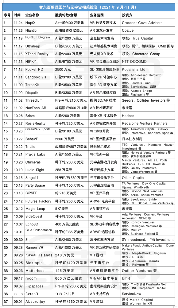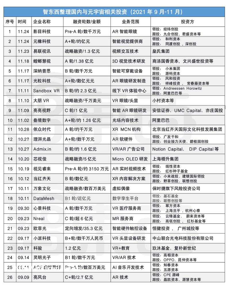 也出现在了与元宇宙相关领域的投融资上。智东西统计了近三个月的国内外元宇宙赛道的投融资情况。2021年12月至11月,国内与元宇宙相关领域千万元***以上的**有26家,国外有35家,总金额超百亿元***。