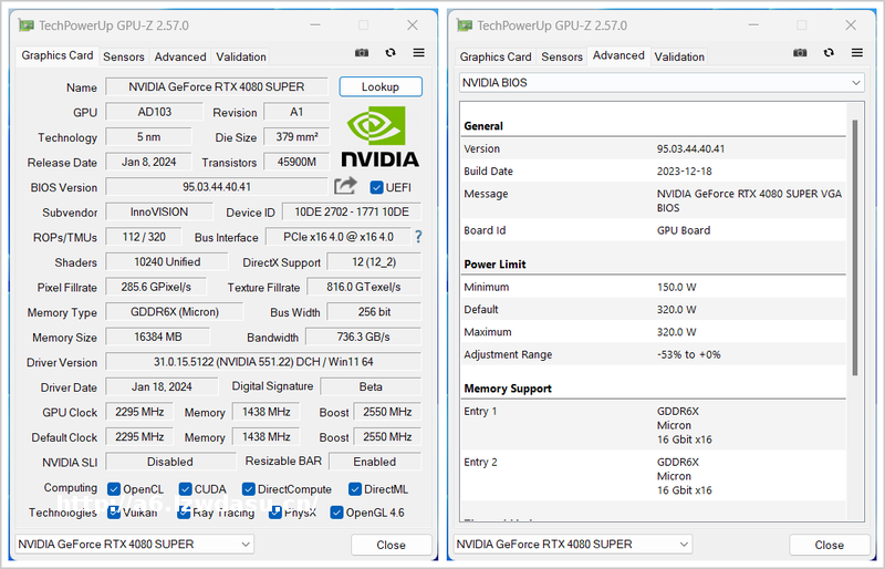 SUPER创始人版保持一致,其GPU频率为2295MHz,Boost频率为2550MHz,显存频率为1438MHz(等效23000MHz)。
