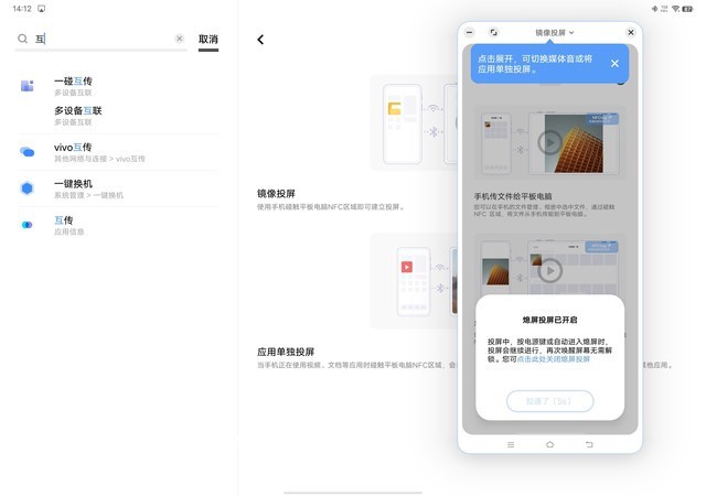 除了传输文件,非常的便捷。一碰传还可以把手机的画面投放在屏幕更大的平板电脑上,