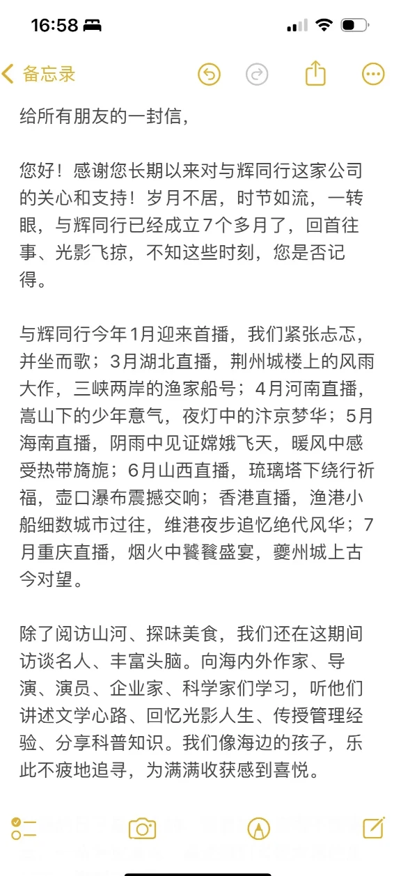 当晚,董宇辉也在**平台发布了「给所有朋友的一封信」,信中董宇辉回顾了与辉同行成立七个月以来的故事,同时也表达了自己对于新东方及俞敏洪的感激。