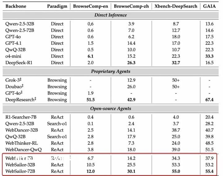 *能表现上,英文版和中文版 BrowseComp 评测集的实测结果显示,WebSailor 跨越了开源和闭源系统之间的鸿沟,WebSailor-32B、WebSailor-72B 不仅在开源模型和 Agent 阵营里实现了断层**,甚至超越了 DeepSeek R1、Grok-3 等闭源模型,仅次于闭源的 OpenAI DeepResearch。