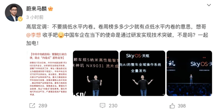 蔚来高管喊话理想 CEO:卷周榜有点「低水平内卷」的意思