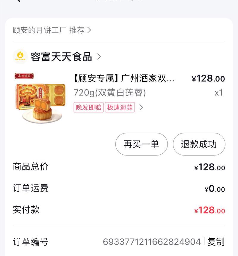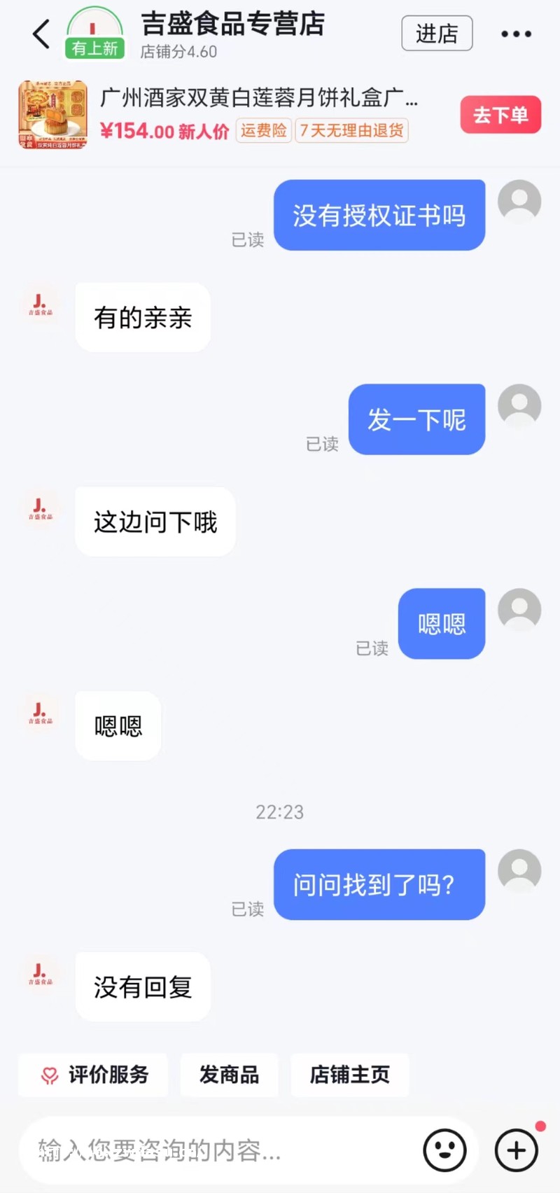 9月22日,他在“顾安的月饼工厂”****间内购买了所谓“广州酒家”双黄白莲蓉月饼,回家打开后发现口味不对,向广州酒家求证后,确认购买到了假货,但向卖家要求**时,却遭到拒绝。