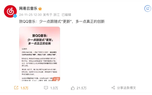 网易云音乐在长文中指出,抄袭了网易云音乐 10 月 25 日上线的音乐播放器「DIY 功能」。长文中还列举了如「黑胶播放界面」、「一起听」等功能的「抄袭」行为。