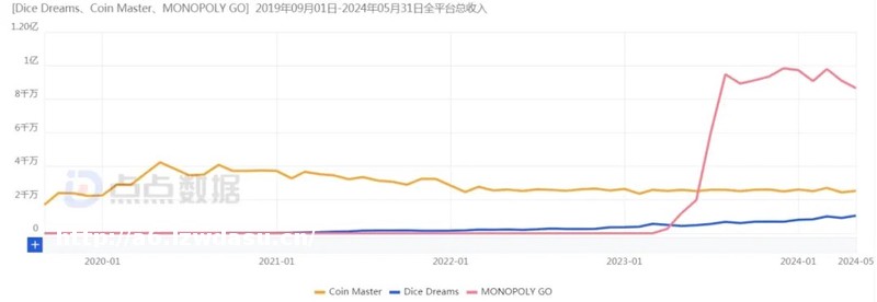 除了收购的「Stumble Guys」之外,Scopely 最近 2 年上线且还在运营的新品只有「MONOPO GO!」和「Garden Joy」。我们再往前翻,会发现,Scopely 做游戏的思路一直是有连贯的。