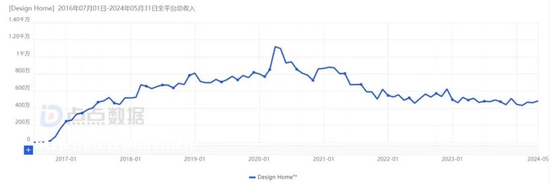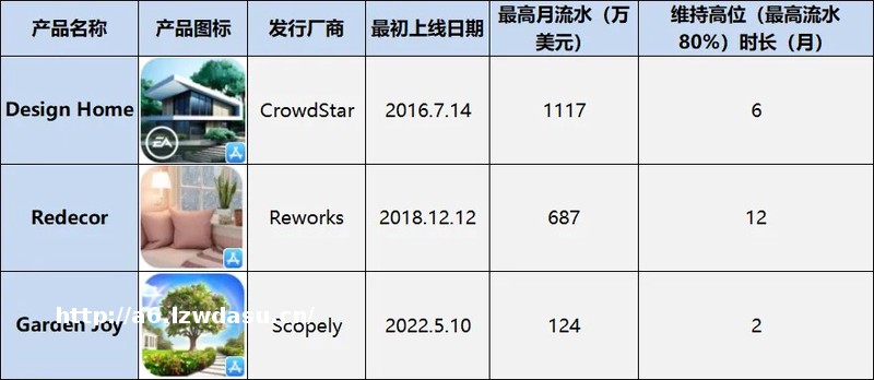 “模拟经营+家装”玩法的**款头部产品在 2016 年 7 月上线,是由 CrowdStar 开发、EA 发行的「Design Home: House Makeover(下文简称Design Home)」。「Design Home」可以说没有直接竞争对手,流水早在 2016 年 12 月就突破 200 万美元,2017 年 3 月突破 400 万美元,在 2020 年 3 月更是突破 1000 万美元,刷新品类天花板。但之后就开始缓慢回落,目前月流水在 430 万美元左右。虽然流水回落,但这款游戏的生命周期已经 8 年了,说实话非常惊人。