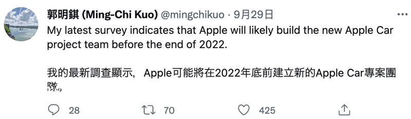 郭明錤在推特发文表示,从最新的调查结果显示,苹果将会在 2022 年底前组建新的汽车团队,这意味着 Apple Car 的**计划又将提上日程。