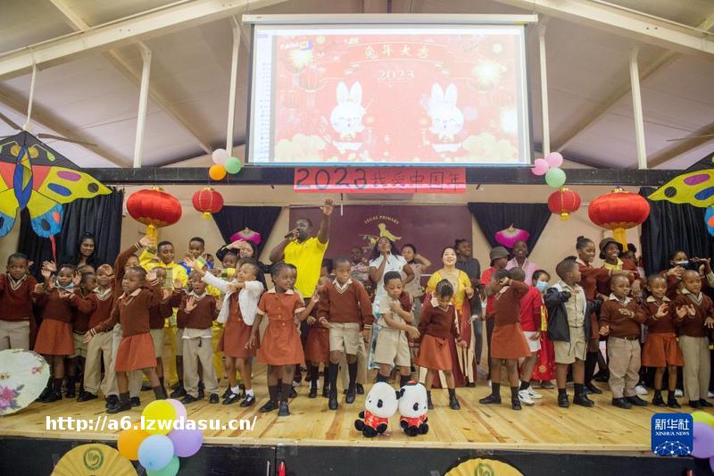 3月1日,在*茨瓦纳首都哈*罗内,*茨瓦纳大学孔子学院在教学点丽海国际小学举办“我爱中国年”迎新春活动。这是老师和**一起表演节目。