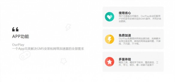 1.新手玩家秒上手,自动安装谷歌框架,一站式提供外服游戏加速必备的运行条件。对于安卓用户而言,玩外服游戏必须要谷歌三件套,OurPlay加速器自动安装省下来很多不必要麻烦。