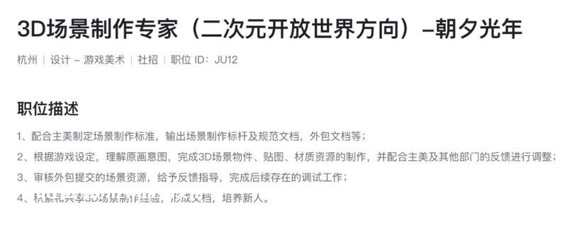 Tech星球了解到,字节在近期开始对这类开放世界的二次元游戏招兵买马,旗下的游戏品牌“朝夕光年”关于二次元开放世界方向的游戏职位有12个,
