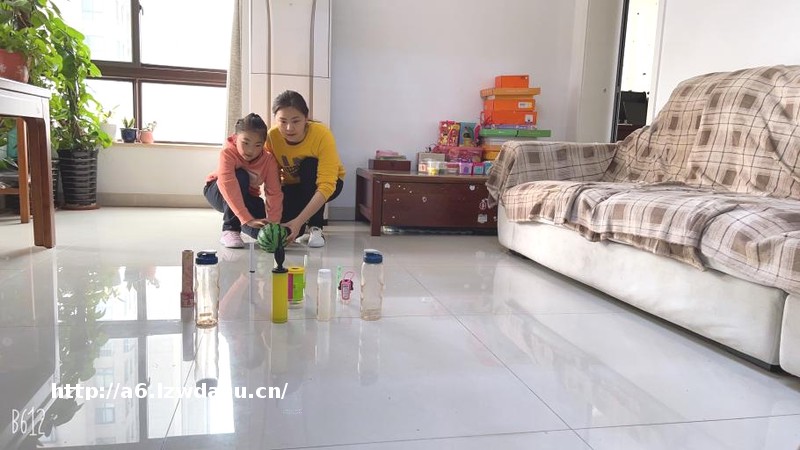 2. 孩子和爸爸或妈妈分两组进行PK。石头剪刀布决定谁先开始,开始后每组将手中的球滚向瓶子。