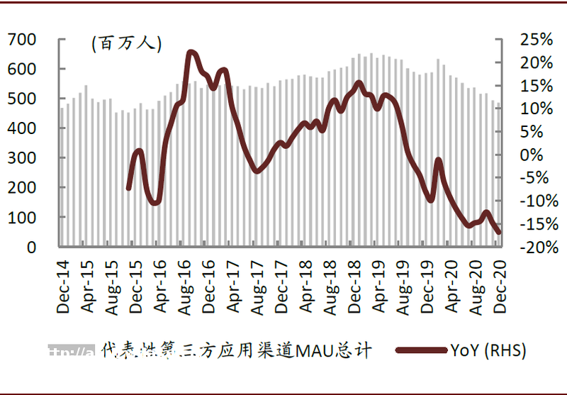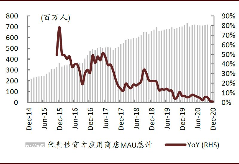 曲线为MAU的同比增速;图示纵坐标轴均为同比增速对应数值,MAU规模仅作相对示意,未设置对应纵坐标轴;