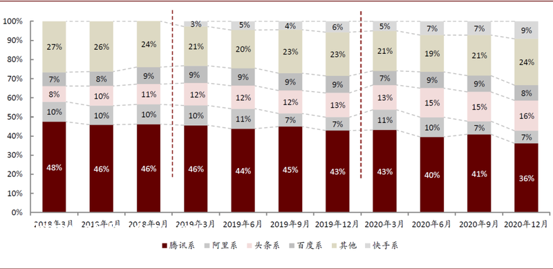 图表:流量聚集地先后经历“从应用商店向**App”“从腾讯系向抖快平台”的转向