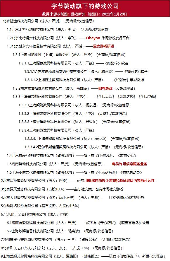 截至 2021 年 1 月,字节跳动旗下已经有了 29 家跟游戏业务相关的主体公司。