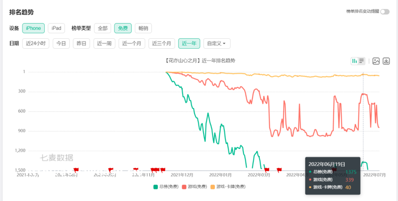 比如,字节投入众多心血的自研游戏——《花亦山心之月》,在上线之初(2021年9月11日)位列 iOS 排行榜免费*名,不过颇有些高开低走的意思,排名不断呈下跌趋势。