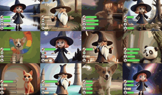实验中,它包括 5 个角色(狗、猫、熊猫、女巫和巫师)、100 个不同的环境和 1,000 个文本提示(每个环境 10 个)。