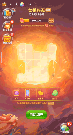 值得注意的是,每个神话故事章节还有单*的主线活动。以女娲章节为例,在进行特殊关卡挑战期间可以获得形状不一的“补天石”和“五色石”(可转化为任意补天石),玩家需要把这些石头拼接在天空的窟窿上,保证每个格子都能“补”上,从而获得积分宝箱奖励。