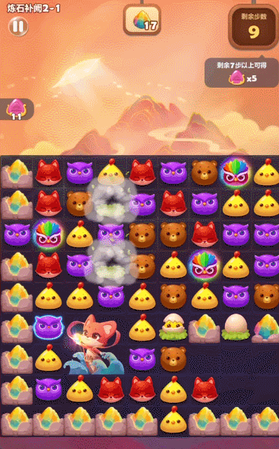 其中后羿射箭后直接消除一排的太阳,女娲会让大量小动物成为**状态,而大禹的**会直接消除一行土块的4层障碍。