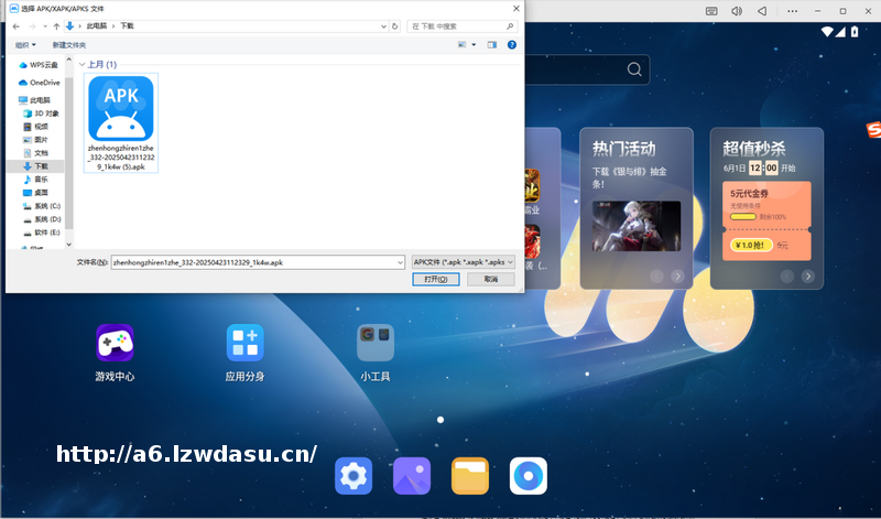 方法二:如果游戏中心没有找到需要的应用,可以通过apk安装,将安装包拖动到模拟器桌面即可进行安装操作。
