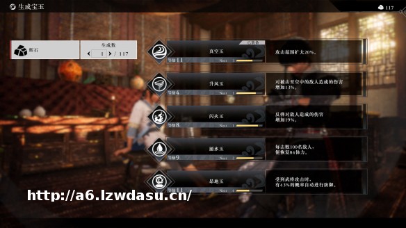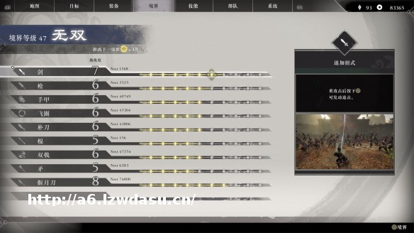 最后就是武将养成了,由于本作无法全程使用名将所以可养成武将只有无名一人。养成分为境界、技能和等级,境界就是各类武器的*练度,和前作不同的是本作只要解锁了的武器种类可以和使用武器一同获得*练度。这一设定有好有坏,虽然减少了武器练度但不常用武器升级后解锁了技能等待使用时容易搞不清之前纠结解锁了哪些技能。